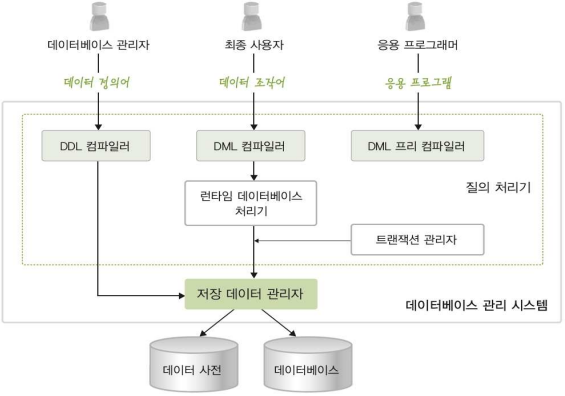 - DDL 컴파일러, DML 프리 컴파일러, DML 컴파일러, 런타임 데이터베이스 처리기, 트랜잭션 관리자 등을 포함