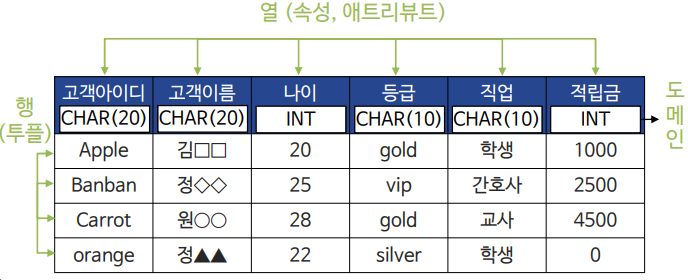 - 하나의 개체에 관한 데이터를 2차원 테이블의 구조로 저장한 것