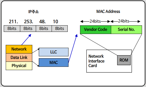 - MAC 주소는 48비트로 구성된 물리적 주소
