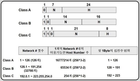 - 32bit로 구성, class A, B, C, D, E로 구분