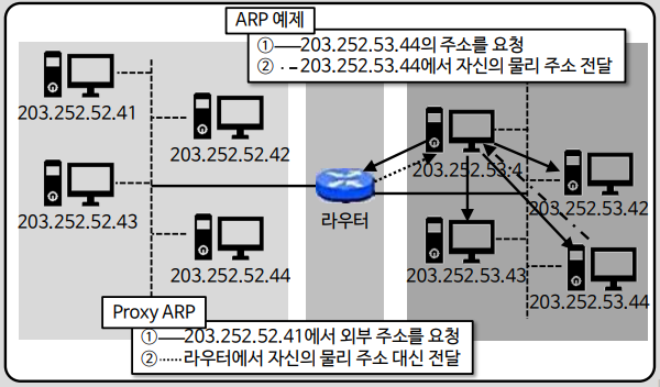 - 라우터가 외부 네트워크에 존재하는 호스트의 ARP 요청에 대해서 자신의 하드웨어 주소로 응답