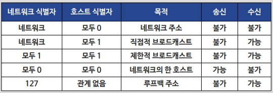 - 패킷의 송신지나 수신지 주소로써 사용 불가