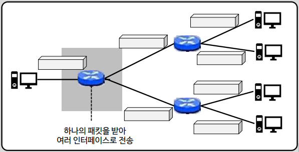 - 멀티캐스트 : 하나의 송신자가 다수의 수신자에게 패킷을 보내는 경우로, 일대다 방식의 패킷 전송 주소, 멀티 캐스트 전송을 수행하기 위해 네트워크 장치가 멀티캐스트를 지원해야 하며, 원하는 그룹에 가입되어 있어야 한다.