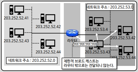 - 브로드캐스트 : 송신자가 네트워크의 모든 호스트에게 패킷을 보내는 방식으로 브로드캐스트 주소에서는 호스트 식별자 필드를 모두 1로 설정한다.