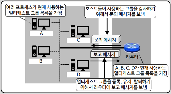 - 멀티캐스트를 지원하는 라우터가 멀티캐스트 그룹에 가입한 네트워크 내의 호스트를 관리하기 위해 사용하는 프로토콜