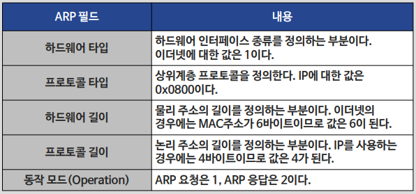 - 호스트는 ARP 요청 메시지를 보낼 때 수신 측 물리 주소는 모르기 때문에 물리 계층 브로드캐스트로 전송