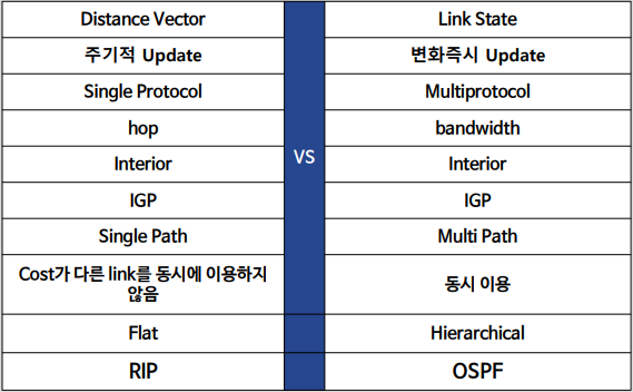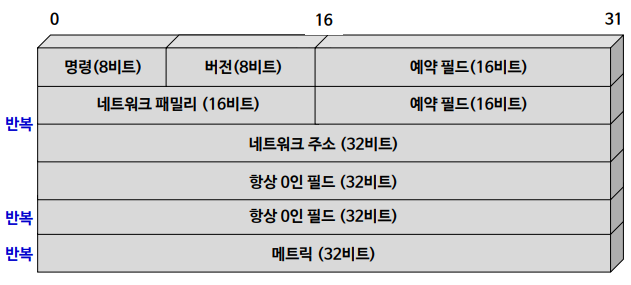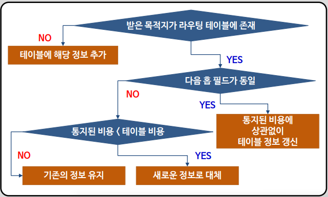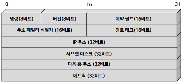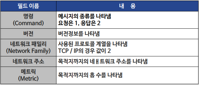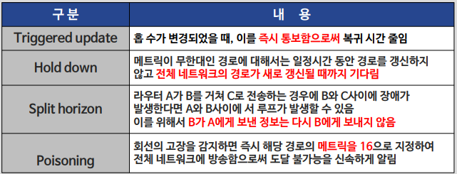 - 거리 벡터 알고리즘으로 메트릭 값을 인접 라우터와 주기적으로 교환하여 라우팅 테이블을 갱신하고 이를 통해 최적경로를 선택