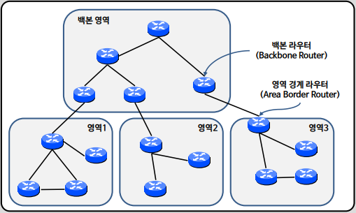 - OSPF는 AS 내에서 계층적 라우팅을 수행하기 위해 AS를 다수의 영역(Area)으로 나누고 각 영역은 독립적으로 OSPF를 수행함