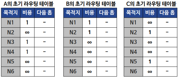 - 인접한 네트워크 비용은 1로 설정되고 그 외의 네트워크에 대한 비용 은 무한대로 설정