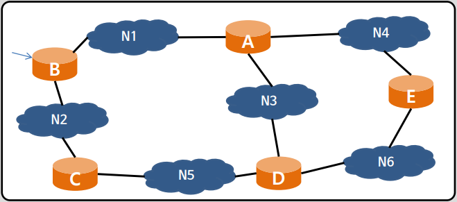 - 라우터 A는 이웃한 라우터 B, D, E와 라우팅 테이블을 첫 번째 라우팅 정보 교환 후, 라우터 A는 인접하지 않아서 알지 못했 던 N2, N5, N6에 대한 정보를 얻을 수 있게 됨