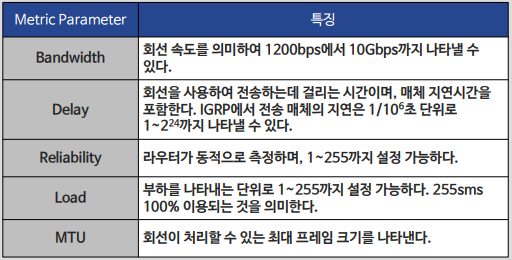 - Metric factor로bandwidth, delay, reliability, load, MTU를 이용