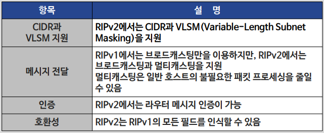 - RIPv2는 라우팅 메시지 인증(Authentication)을 통해 RIP 경로가 임의로 변경되는 것을 방지하며, 특정 라우터들 끼리만 경로 정보를 공유할 수 있음