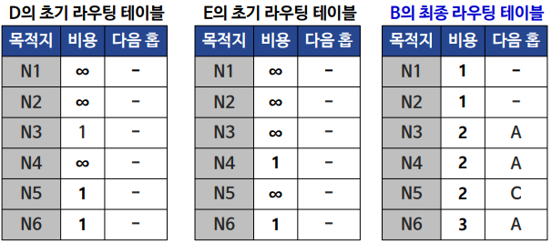 - 라우터 A의 경우 처음에는 인접 네트워크인 N1, N3, N4에 대한 정보만을 갖는 라우팅 테이블을 구성