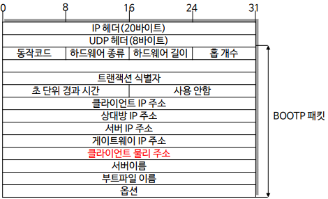 - 여러 BOOTP 클라이언트가 동시에 사용되는 경우 헤더의 트랜잭션 식별자 혹은 물리 주소를 검사하여 구별
