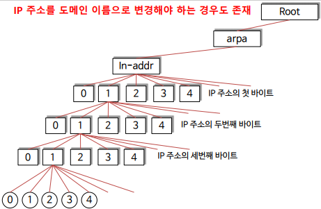 - In-addr 도메인 아래에는 0부터 255까지 이름을 가진 256개의 서브 도메인이 존재. 이는 IP 주소의 첫 번째 바이트 값을 의미