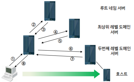 - 로컬 DNS 서버는 새로운 반복 쿼리를 최상위 레벨 도메인 서버로 전송